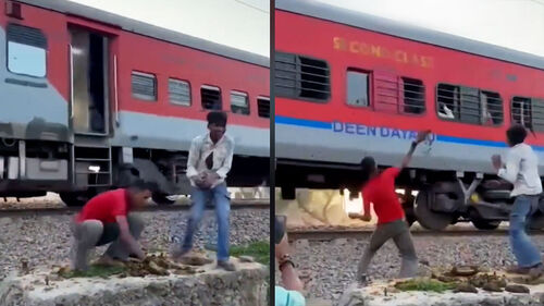 선로 바로 옆에 서 있던 남성들이 빠르게 지나치는 열차를 향해 뭔가를 던지며 즐거워합니다.