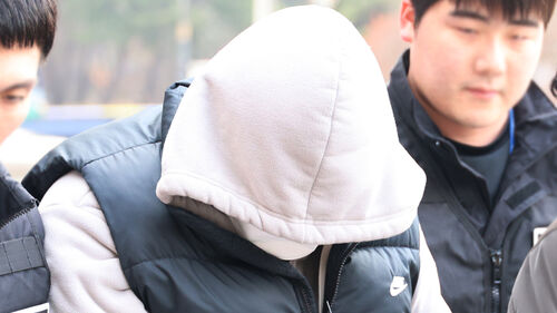 ▲ 빚 독촉을 하던 지인을 살해하고 시신을 야산에 암매장한 40대가 9일 영장실질심사가 열리는 청주지법에 출석하고 있다.