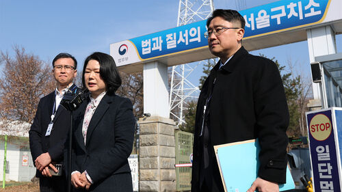 ▲ 위은진 이태원참사 청문회 준비단장(가운데)이 10일 경기도 의왕 서울구치소 앞에서 윤석열 전 대통령과의 면담이 불발된 뒤 브리핑을 하고 있다.
