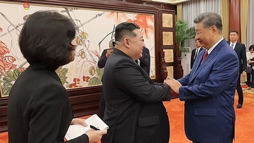 ▲ 지난 2025년 9월 북한 조선중앙TV가 공개한 김정은 위원장과 시진핑 중국 국가 주석간 북-중 정상회담에 이어 시 주석이 마련한 연회에 참석해 손을 맞잡은 모습.