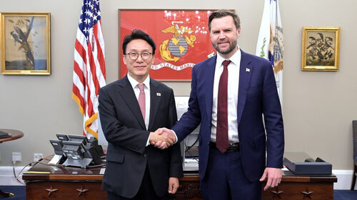 ▲ 김민석 국무총리와 JD 밴스 미국 부통령이 12일(현지시간) 워싱턴 DC의 백악관에서 만나 악수하고 있다