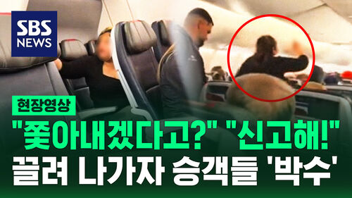 보안 요원의 인도에 따라 여성이 기내 밖으로 퇴장하자, 지켜보던 다른 승객들은 환호성을 지르거나 박수를 치며 안도하는 모습을 보였습니다.