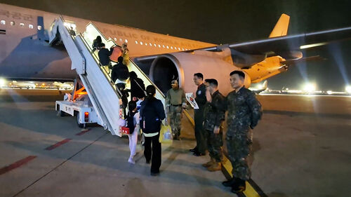 중동에 고립됐던 우리 국민 200여 명의 대피를 돕기 위해 급파된 공군 수송기가 2시간쯤 전 성남공항에 도착했습니다. 천신만고 끝에 탑승한 수송기 안에서는 안도감 속 환호가 터져 나왔습니다.