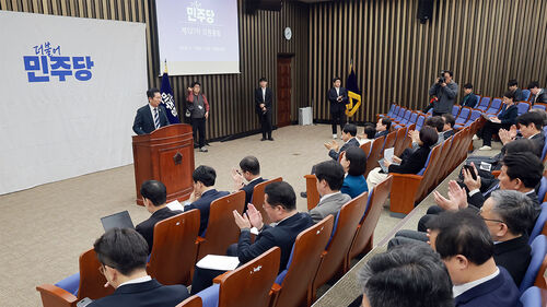 ▲ 더불어민주당 정청래 대표가 17일 국회에서 열린 의원총회에 참석해 중수청·공소청법안 당정청 협의와 관련해 이재명 대통령의 검찰개혁 의지를 언급하자 민주당 의원들이 손뼉 치고 있다.