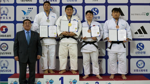 ▲ 김민종(왼쪽 세 번째)이 17일 충남 보령종합체육관에서 열린 2026 회장기 전국유도대회 겸 2026년 2차 국가대표 선발전에서 우승을 차지해 메달을 목에 걸고 포즈를 취하고 있다.