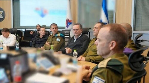 ▲ 이스라엘 카츠 이스라엘 국방부장관(가운데)이 이스라엘군 수뇌부와 상황평가 회의를 하고 있다.