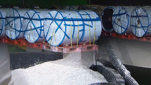 기계에서 플라스틱이 마치 원단처럼 계속 뽑혀 나옵니다.