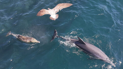 ▲ 19일 오전 제주 서귀포시 대정읍 앞바다에서 폐어구에 몸이 감겨 등지느러미를 잃은 새끼 남방큰돌고래 '쌘돌이'(왼쪽)가 유영하고 있다.