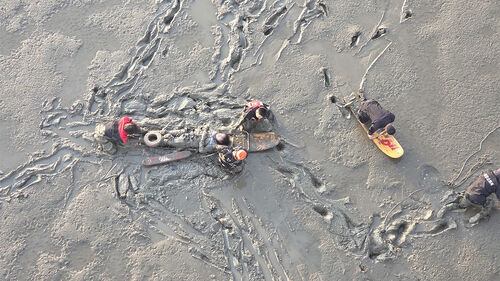 사고 지점은 조수간만의 차로 인해 접근이 어려운 갯벌 지형이었으나 구조대는 자체 개발한 갯벌 특수 구조 장비인 '갯보드'를 이용해 A 씨에게 접근했습니다.