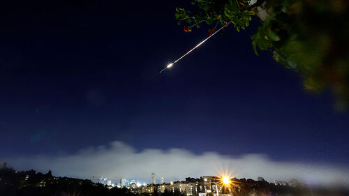 현지 시각 21일 밤 이스라엘 북부 나하리야 상공에서 이란의 탄도 미사일과 이스라엘의 요격 미사일이 서로 얽힙니다.