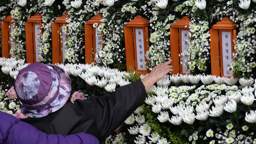 ▲ 22일 대전시청에 마련된 대전 안전공업 화재 희생자 합동분향소에서 한 유족이 아들 이름을 향해 손을 뻗고 있다.