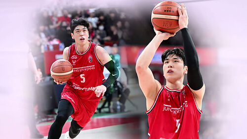 변준형이 상대 패스를 가로챈 뒤 그대로 스피드를 살려 속공에 성공하고, 신장이 10cm는 더 큰 장신 수비수를 앞에 두고 스텝백 3점슛까지 꽂아 넣습니다.