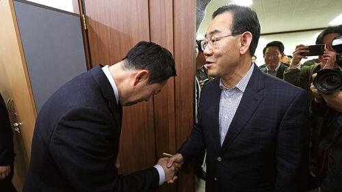 ▲ 지난 22일 오전 국민의힘 대구시당에서 열린 장동혁 대표와 지역 국회의원의 비공개 연석회의에서 주호영 의원이 장 대표와 악수를 하고 있다.