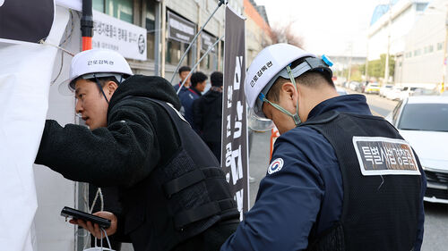 ▲ 24일 오전 대전 대덕구 안전공업 2일 차 현장 감식에 나선 대전고용노동청 근로감독관들이 안전공업 노조 임시 사무실을 확인하고 있다.