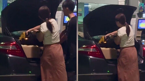 한 쌍의 남녀가 차량 트렁크를 열어둔 채 연료를 주입하고 있는데요.