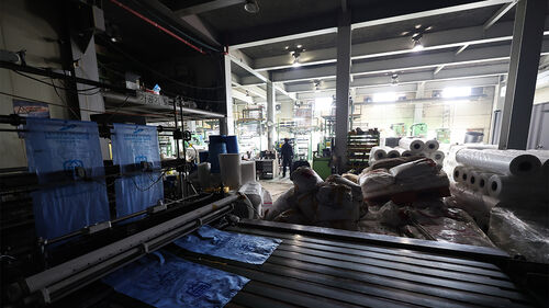 ▲ 24일 중동 사태에 따른 폴리에틸렌 등 원료 수급 불안 영향으로 최근 일시적으로 인원 감축 운영에 들어간 경기 안산시의 한 비닐봉투, 종량제 봉투 제조 공장 내 가공 작업대의 불이 꺼져있다.
