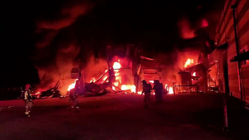 공장 건물 전체가 시뻘건 불길과 뿌연 연기로 뒤덮여 있고, 소방대원들이 불을 끄기 위해 분주하게 움직입니다.