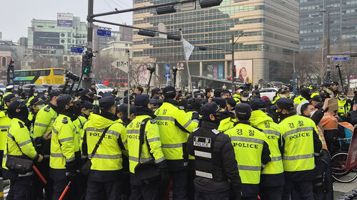 경찰은 "차량 운행에 상당한 지장을 초래하는 만큼 법에 따라 이격 조치를 하겠다"고 경고 방송을 한 뒤 이들을 물리적으로 끌어내고 있습니다.