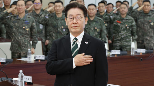▲ 이재명 대통령이 27일 서울 국방부에서 열린 전군주요지휘관회의에서 국기에 경례하고 있다