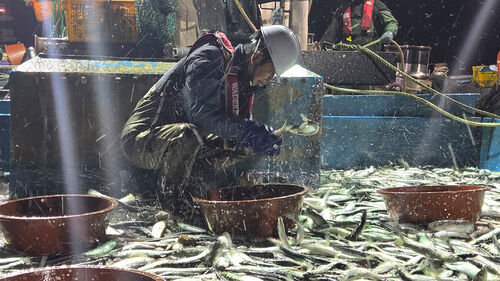 ▲ 더불어민주당 정청래 대표가 28일 새벽 경북 영덕 앞바다에서 조업에 참여해 잡은 물고기를 옮기고 있다.