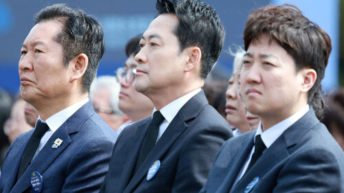 ▲ 더불어민주당 정청래 대표, 국민의힘 장동혁 대표, 개혁신당 이준석 대표가 27일 국립대전현충원에서 이재명 대통령의 서해수호의 날 기념사를 듣고 있다.