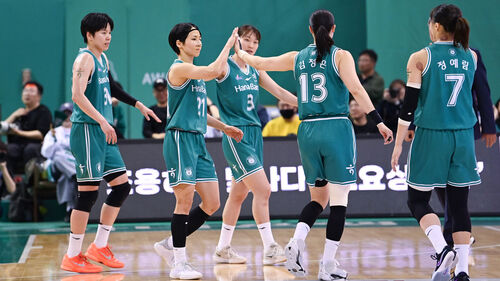 ▲ 이이지마 사키(왼쪽에서 두 번째) 등 하나은행 선수들