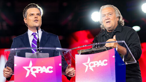 ▲ 텍사스서 열린 CPAC서 연설하는 맷 게이츠(왼쪽)와 스티브 배넌