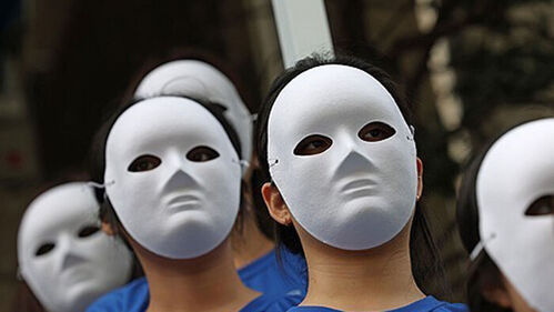▲ 푸른나무재단 관계자들이 지난 2023년 9월 12일 푸른나무재단에서 열린 2023 전국 학교폭력·사이버폭력 실태 조사 및 대책 발표 기자회견에서 '방관의 탈'을 쓰고 퍼포먼스하는 모습