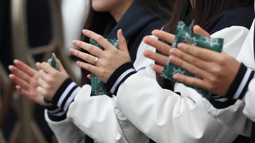 ▲ 2026학년도 대학수학능력시험일인 13일 강원특별자치도교육청 제49지구 제1시험장이 마련된 춘천고등학교에서 학생들이 핫팩을 손에 쥐고 수험생 선배들을 응원하고 있다.