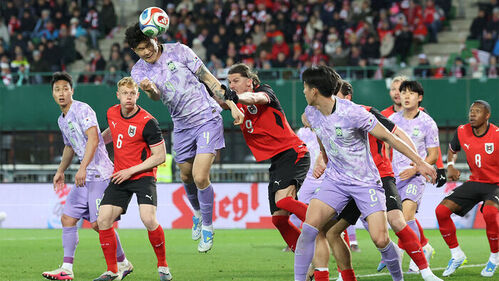 ▲ 오스트리아 빈 에른스트 하펠 스타디움에서 열린 한국 축구 국가 대표팀과 오스트리아의 평가전에서 김민재가 오스트리아 문전에서 헤딩슛을 시도하고 있다.