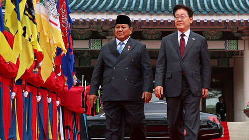 ▲ 이재명 대통령이 1일 청와대에서 국빈 방한한 프라보워 수비안토 인도네시아 대통령과 공식 환영식장으로 향하고 있다.