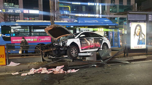 이후 A 씨가 몰던 택시는 옆 차로를 달리던 승용차와 추돌한 뒤, 중앙선을 넘어 버스정류장으로 돌진했습니다.