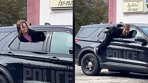 그런데 경찰차 뒷좌석 열린 창문 틈 사이로 한 여성이 보입니다.