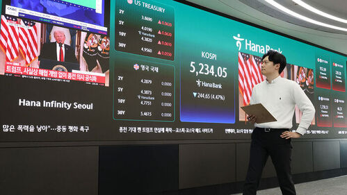 ▲ 2일 서울 중구 하나은행 본점 딜링룸에 도널드 트럼프 미국 대통령의 대국민 연설 뉴스가 나오고 있다