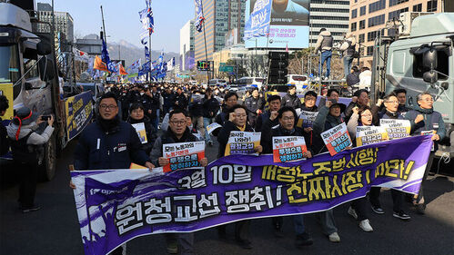 ▲ '노란봉투법'(노동조합 및 노동관계조정법 2·3조 개정 법률) 시행 첫날인 3월 10일 서울 세종로에서 열린 민주노총 투쟁 선포대회에서 집회를 마친 민주노총 조합원 등이 행진하고 있다.