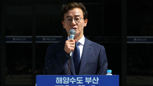 ▲ 더불어민주당 전재수 의원이 지난 2일 오전 부산 동구 해양수산부 청사에서 부산시장 출마 선언을 하고 있다.