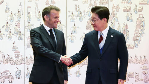 ▲ 이재명 대통령과 에마뉘엘 마크롱 프랑스 대통령이 3일 청와대에서 공식환영식 후 악수하고 있다.