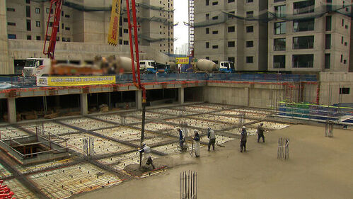 지하 주차장 바닥 공사를 위해 콘크리트가 쉴 새 없이 쏟아집니다.
