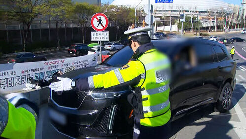 교통경찰이 호루라기를 불며 전세버스를 갓길로 멈춰 세웁니다.