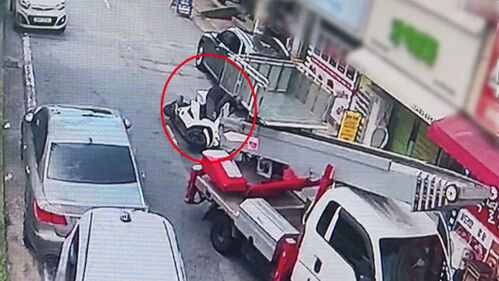 후방 블랙박스나 주차 센서가 없는 차량만 골라 차가 후진하는 순간 오토바이를 일부러 바짝 붙여 들이받게 하는 겁니다.