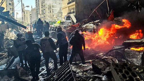 폭격을 받은 건물은 폭삭 주저앉았고, 근처 차량은 모두 불에 타버렸습니다.