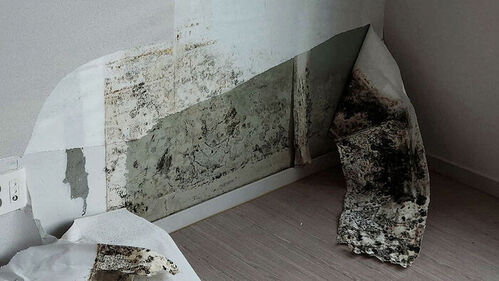 바닥재 사이사이로 검은곰팡이가 올라왔고, 벽지 안쪽까지 얼룩진 흔적이 확인됩니다.