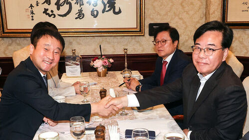 ▲ 더불어민주당 한병도 원내대표(왼쪽)와 국민의힘 송언석 원내대표가 10일 서울 여의도 켄싱턴 호텔에서 추경안 관련 논의를 하기에 앞서 악수하고 있다.