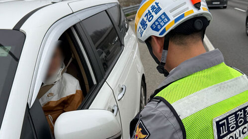 ▲ 11일 오전 경기 화성시 동탄구 인근 경부고속도로에서 한 남성이 버스전용차로 단속에 걸려 범칙금을 부과받고 있다.