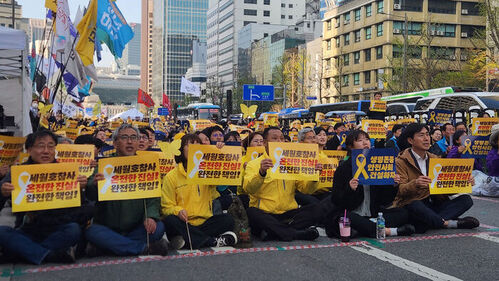 이들은 '세월호 참사 온전한 진실 완전한 책임', '생명존중 안전사회 건설하자' 등의 구호가 적힌 손팻말을 들고 국가책임 인정과 공식 사과, 비공개 기록 전면 공개.