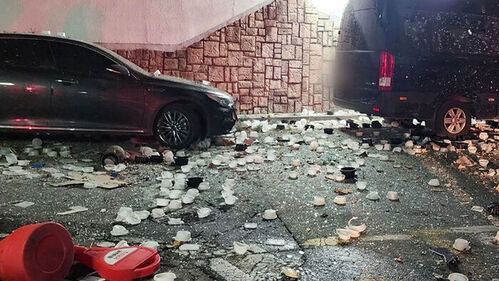 한 음식점 앞 차량이 부서진 채 뒤집혀 있고, 깨진 유리 파편이 길가와 차량 위에 흩뿌려져 있습니다.