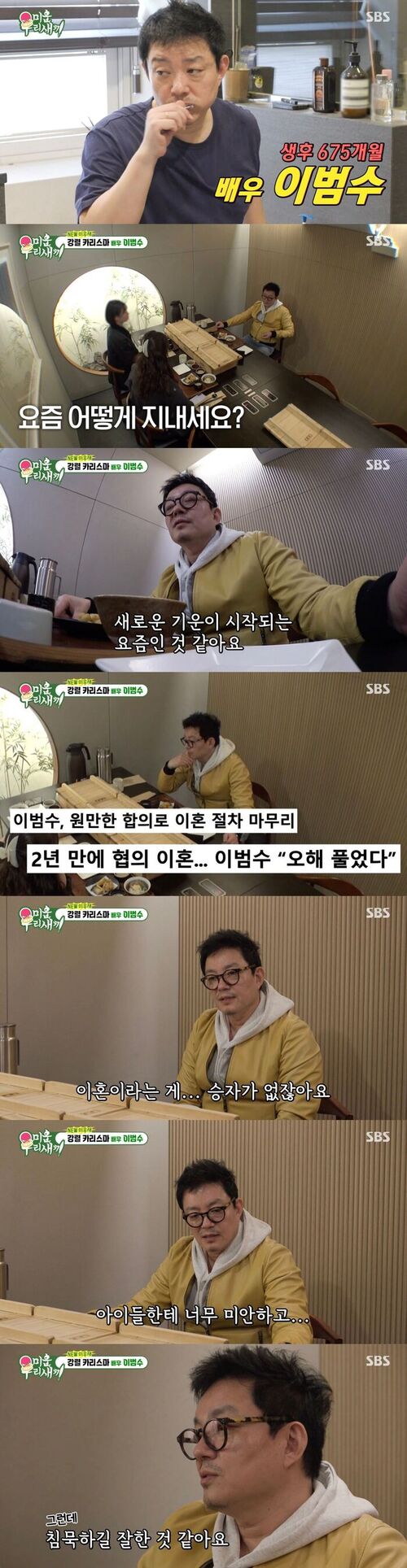 제작진은 결혼 생활을 마무리하니 기분이 어떤지 물었다. 그러자 이범수는 "이혼이라는 게 승자가 없다. 둘 다 아플 거다. 둘이 아니다. 아이들이 있으니까"라며 "아이들이 있으니 내가 아픈 건 중요한 게 아니다. 아이들한테 너무 미안하고 가족들에게 아픔을 남겨서 아쉽다"라고 솔직하게 말했다.
