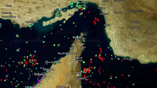 지금 빨간색으로 표시된 유조선들이 해협에 가까이에 다가가지 못하고 양쪽에서 대기 중인 모습을 볼 수 있습니다.