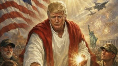 인공지능(AI)으로 생성한 것으로 추정되는 이미지였는데, 트럼프 대통령 주변으로 광채가 나고 왼손에 환한 빛이 나는 무언가를 들고 있는 모습이었습니다.
