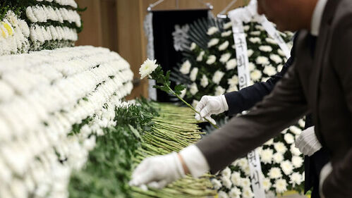 ▲ 지난 13일 전남 완도군 문화예술의전당에 마련된 故(고) 박승원 소방경·노태영 소방교를 위한 합동분향소에서 추모객들이 헌화하고 있다.
